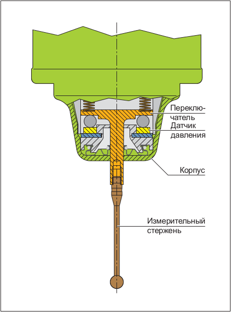 Отклонение измерительного щупа датчика TS 740 определяется с помощью показаний нескольких датчиков давления, которые расположены между переключателем и корпусом датчика. При измерении заготовки стержень отклоняется и изменяется сила, действующая на датчики давления. Вырабатываемые при этом сигналы обрабатываются и генерируется коммутационный сигнал. Благодаря небольшим силам воздействия обеспечивается высокая точность и повторяемость результатов измерений.